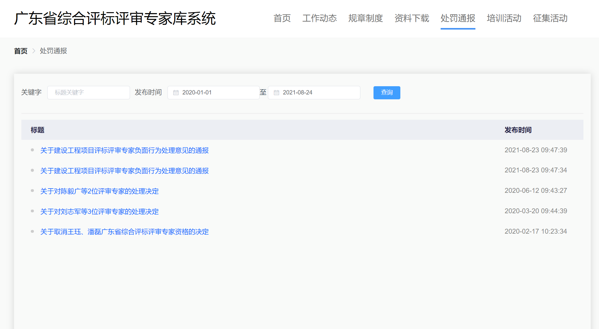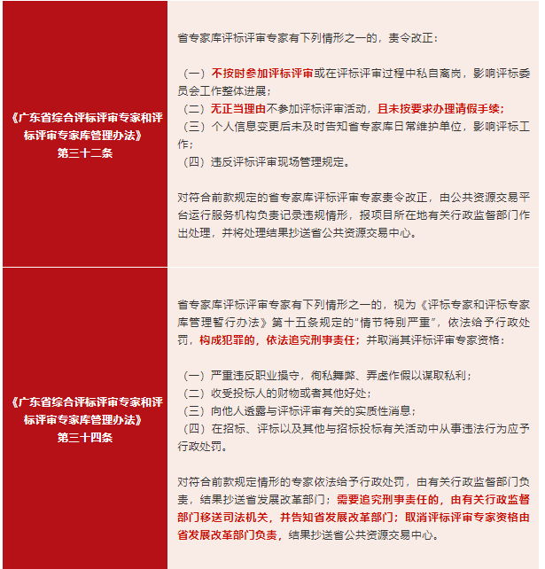 2020年至今,廣東省綜合評標評審專家庫系統共對15名評標專家進行處罰通報,其中違反《廣東省綜合評標評審專家和評標評審專家庫管理辦法》第三十二條規定的評標專家共13人,5人因無正當理由不參與評標評審活動,且未按要求辦理請假手續、不按時參加評標評審活動被責令改正,其余8人因遲到、缺席等負面行為被責令改正并記入違規記錄;2名評標專家因犯串通投標罪,違反《廣東省綜合評標評審專家和評標評審專家庫管理辦法》第三十四條被取消廣東省綜合評標評審專家資格并永久移除出庫。