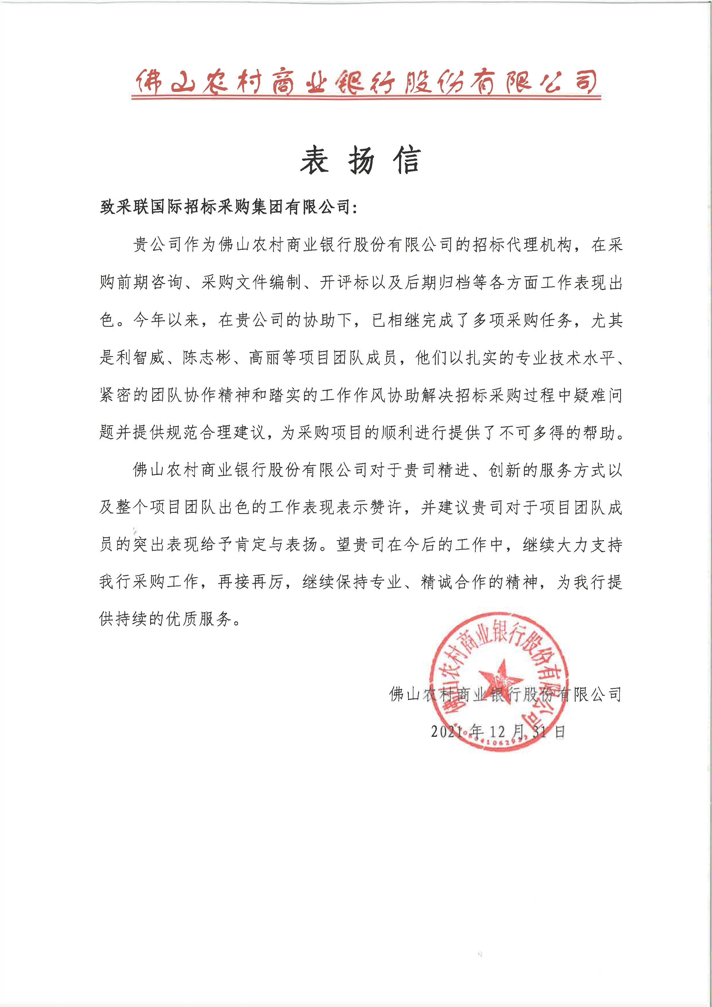 2021年12月31日,佛山農村商業銀行股份有限公司向采聯集團致表揚信,對采聯集團2021年以來,在采購前期咨詢、采購文件編制、開評標以及結項存檔等各方面工作表示肯定與認可,并對采購項目的順利開展和項目團隊的專業服務表示感謝與贊許。